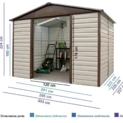 L’abri en métal est marron et beige et s’intègre parfaitement à votre jardin. Il est équipé d’une grande double porte coulissante de 120 cm de largeur et de 178 cm de hauteur.