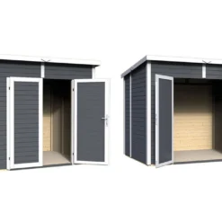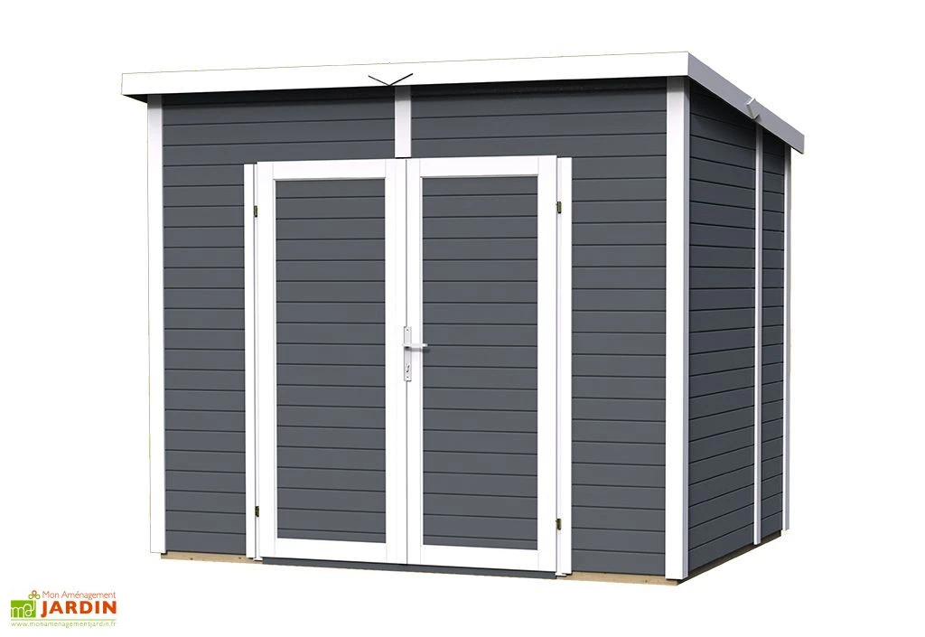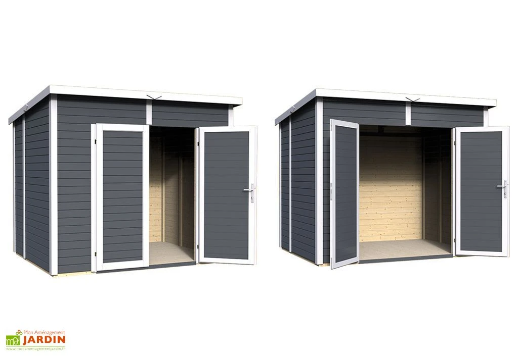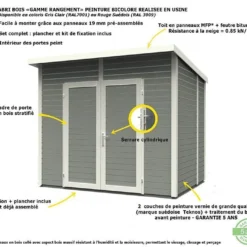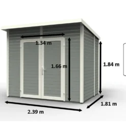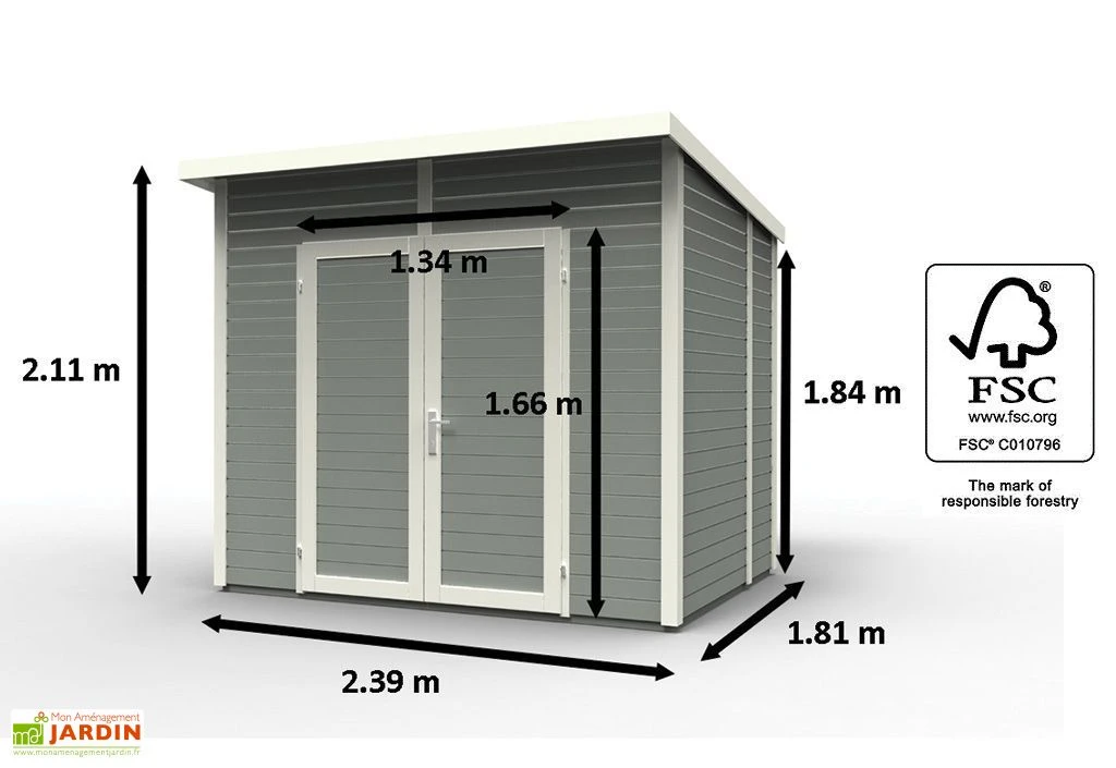 Votre abri de jardin en bois Skur 4 de chez Rowlinson est adossable. L’abri en sapin du nord FSC de 19 mm mesure 239 x 181 x 211 cm (l,l,h). Le toit en MFP et son feutre noir a une Ă©paisseur de 12 mm, son inclinaison est de 5,6°. La pente peut ĂŞtre placĂ©e Ă l’avant ou Ă l’arrière. L’abri est livrĂ© avec son plancher, il existe dans deux coloris au choix : Gris Anthracite ou Gris clair (RAL 7001). La garantie est de 5 ans.