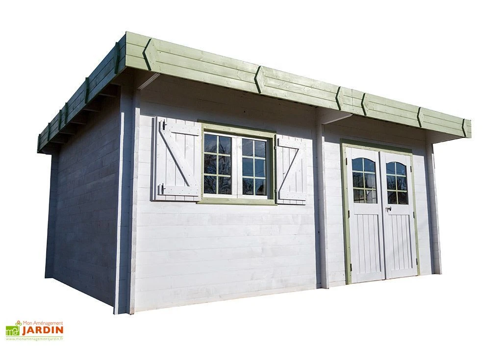 L’abri est constituĂ© de madriers emboitĂ©s de 42 mm d’Ă©paisseur Ă double rainurage. La surface intĂ©rieure de 17,47 m² vous permet, dans la plupart des communes, d’installer votre abri sans demander de permis de construire. Il dispose d’un toit plat en bac acier (pente de 2°), d’une grande double porte battante de 140 x 180 cm (l,h) et de 2 fenĂŞtres ouvrantes de 78 x 48,5 cm (l,h) avec volets.