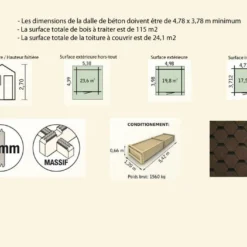 La toiture de l’abri de jardin est en bois massif de 18 mm recouvert de bardeaux bitumineux. La surface de toiture Ă couvrir est de 24,1 m². Les solives traitĂ©es et le plancher sont fournis. Votre abri doit ĂŞtre installĂ© sur une chape de bĂ©ton ou sur des plots, non fournis. Les dimensions extĂ©rieures hors tout sont de 4,39 x 5,38 m (l,l). Les dimensions extĂ©rieures de l’abri sont de 3,98 x 4,98 x 2,70 m (l,l,h). Les dimensions intĂ©rieures sont de 3,71 x 4,71 m (l,l), pour une surface utile de 17,5 m².Â