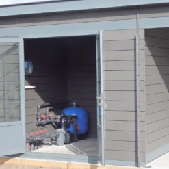 Le cabanon de jardin est fabriqué en aluminium pour les lames de sol, les pannes de toit et la double porte. Les lames qui composent les parois et la toiture sont quant à elles en bois composite gris de 28 mm d’épaisseur. Le bois composite est un mélange de bois (dont 60% est issu de bois recyclé) et de PEHD, un alliage particulièrement résistant aux agressions extérieures.