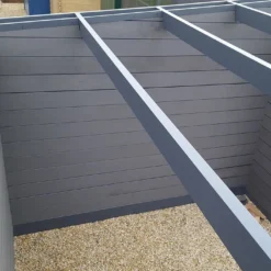 La cabane Actual 6 x 3 comprend un toit plat, bénéficiant d’une pente d’environ 11% qui permet à l’eau de pluie de s’écouler. Les pannes de toit sont en aluminium et les voliges sont en bois composite. Il est nécessaire de recouvrir cette toiture avec des bardeaux bitumeux pour une étanchéité totale. Vous trouverez également une couverture en plaques d’acier spécialement adaptée à l’abri dans la rubrique « Accessoires ».