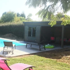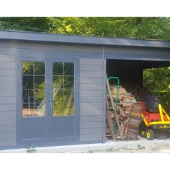 Elle comprend également une double porte vitrée en aluminium. Cette porte mesure 144 x 195 cm (l,h) et dispose de double vitrage, de 2 poignées et d’une serrure à clés pour protéger vos biens. Enfin un auvent vous permettra de stocker votre bois de chauffage, de protéger vos vélos ou encore d’installer un salon de jardin pour profiter du jardin tout en restant protégé du soleil ou de la pluie.
