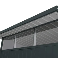 L’abri de jardin Duramax au design moderne s’intègre dans tous les jardins grâce à sa toiture monopente et à ses panneaux couverts d’une peinture gris anthracite RAL 7016. Son avancée de toit Skylight permet de faire entrer la lumière naturelle en créant un vrai puits de lumière.