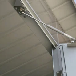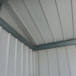 La cabane en métal dispose d’une toiture en pente et mesure 2,29 m de hauteur à l’avant et 1,88 m de hauteur à l’arrière. La hauteur intérieure à l’avant de l’abri est de 2,22 m. L’avancée de toit Skylight permet d’offrir un puits de lumière naturelle à l’abri.