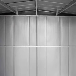 Avec des dimensions extérieures de 3,13 x 2,42 m (largeur x profondeur), cette cabane de jardin en métal occupera une surface de 7,5 m² une fois installée dans votre jardin. Elle offre un espace intérieur quasi identique que vous pourrez mettre à profit pour ranger vos outils, des vélos ou du matériel de jardinage et dans lequel vous pourrez accéder facilement grâce à la présence d’une double porte coulissante de 141 x 152 cm (largeur x hauteur).