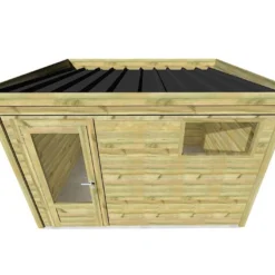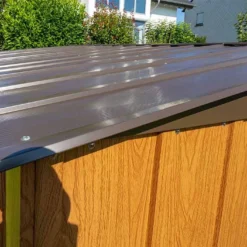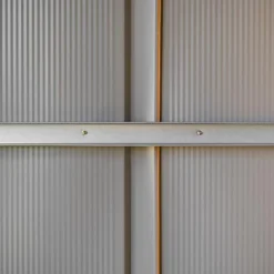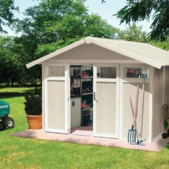 Ce cabanon de jardin de 11,58 m² (surface au sol) est donc conçu en acier galvanisé, un matériau intéressant car très résistant face aux agressions extérieures, et notamment face à la rouille, et ce sans exiger de traitement ou d’entretien particulier. Ses parois de 0,3 mm d’épaisseur sont surmontées d’une toiture à deux pans capable de supporter une charge de neige de 100 kg/m² et intègrent une double porte coulissante de 141 x 152 cm, pour un accès simplifié à l’intérieur de l’abri.