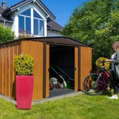 L’abri de jardin Woodlake de la marque Spacemaker vous permettra de ranger vos outils, du matériel de jardinage, des poubelles ou du mobilier de jardin une fois l’hiver venu. Il pourra également faire office de garage à vélos afin de les protéger des intempéries. Bien que fabriqué en métal, il dispose de plus d’une finition effet bois qui facilitera grandement son intégration dans votre jardin !