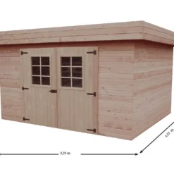 Cet abri de jardin offre un espace intérieur de 11,38 m², ce qui est idéal pour ranger des outils, du matériel de jardinage, des vélos ou tout autre équipement d’extérieur. Une fois monté, il occupera une surface de 14,75 m² dans votre jardin. Notez qu’il n’est cependant pas traité contre les menaces que représentent l’humidité, les insectes ou encore les champignons. Vous devrez donc appliquer une lasure et un traitement fongicide à l’intérieur et à l’extérieur de l’abri juste avant son installation.