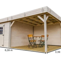 Le toit monopente de cet abri affiche une légère pente de 2° afin de faciliter l’écoulement de l’eau pendant une averse. Le tout est couvert d’un bac en acier, assurant ainsi la bonne étanchéité de la toiture. Il possède une avancée à l’avant et à l’arrière de 22 cm. Ce toit repose sur des parois constituées de madriers en épicéa massif de 28 mm d’épaisseur. Notez que cet abri est livré sans plancher.