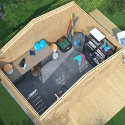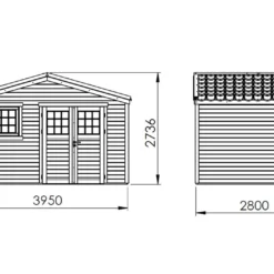 L’abri de jardin Shelty+ offre une surface intérieure de 10,9 m², soit suffisamment d’espace pour ranger vos outils, votre matériel de jardinage ou encore des vélos, par exemple. Une fois monté, il occupera une superficie de 11 m² (surface au sol). Ses parois sont composées de madriers de 28 mm d’épaisseur conçus en épicéa.