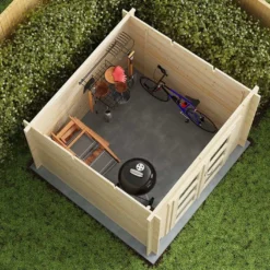 L’abri mesure 2,38 x 2,48 x h. 2,18 m pour une surface extérieure de 5,9 m². Les voliges sont en bois massif afin d’assurer la solidité du chalet. Elles sont recouvertes de feutre bitumeux pour assurer l’étanchéité de l’abri.