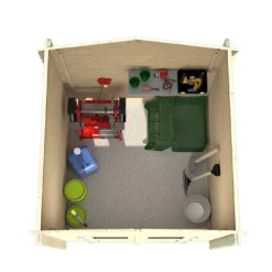 Les dimensions de l’abri sont de 220 x 220 cm, pour 214 cm de hauteur au faîtage. Les murs disposent d’une hauteur de 187 cm. Le cabanon en bois est équipé d’une porte double mi-vitrée avec des charnières pour faciliter l’ouverture et la fermeture, et il intègre un verrou targette pour la sécurité de vos outils. L’abri de jardin en bois est doté de voliges de 18 mm recouvertes d’un feutre bitumé noir pour protéger le toit des intempéries.
