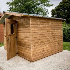 Le cabanon de jardin Therma de la marque Habrita est fabriqué en France, en bois d’épicéa thermochauffé. Ce type de traitement 100% naturel permet de protéger le bois des intempéries, de l’humidité et des insectes en le chauffant à très haute température. Ainsi protégé, le bois n’exigera aucun traitement supplémentaire et l’abri de jardin de vous demandera quasi aucun entretien ! Le bois utilisé est même certifié PEFC, ce qui signifie qu’il est issu de forêts gérées de manière responsable et durable.