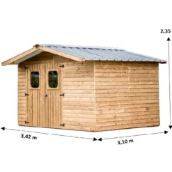 Cet abri de jardin en bois est idéal pour ranger des outils, du matériel de jardinage ou encore des vélos. Ses dimensions au sol sont de 3,16 x 2,40 m (7,58 m²) et il offre un espace intérieur de 7,25 m² que vous pourrez aménager en fonction de vos besoins et au sein duquel vous pourrez pénétrer aisément grâce à une double porte de 160 x 182 cm. Vous pourrez ainsi entrer à l’intérieur de l’abri même avec du matériel relativement encombrant.