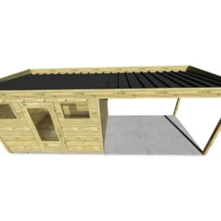 La partie cabane de jardin est équipée d’une porte vitrée de 79 x 190 cm et de deux fenêtres avec vitrages en verre de 4 mm d’épaisseur. Vous profiterez donc d’une belle luminosité une fois à l’intérieur de l’abri et la porte pourra même être verrouillée afin d’en sécuriser le contenu. Notez que cet abri est livré en kit et que les découpes pour la porte, les fenêtres et les bandeaux devront être réalisées par vos soins. Une notice détaillée vous précisera clairement les dimensions à respecter pour ces découpes.