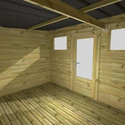 Cette remise de jardin est livrée accompagnée d’un plancher en bois massif conçu à partir de chevrons de 45 x 70 mm et de planchettes de 16 mm d’épaisseur, le tout également traité par autoclave. Ce plancher se chargera d’isoler le sol de l’abri des remontées d’humidité en plus de contribuer à sa bonne stabilité et aux finitions de l’ensemble. La toiture de l’abri et de l’auvent se montrera quant à elle parfaitement étanche grâce à sa couverture en bac acier 65/100 et l’eau de pluie s’écoulera de manière efficace (inclinaison du toit : 5°).