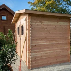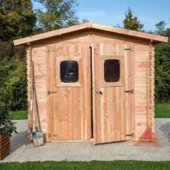 Les parois sont constituées de madriers de 28 mm d’épaisseur. Ces lames s’emboitent et se fixent facilement à l’aide d’un système de rainures et languettes. Elles sont biseautées pour offrir une jolie finition à l’ensemble. La coupe chalet de ces madriers permet un montage en angle solide et parfaitement étanche.