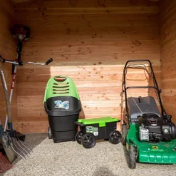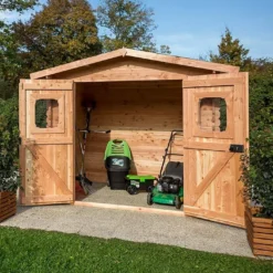 La cabane de jardin en bois Douglas est fabriquée en France par Habrita. Elle offre une surface utile de 4,16 m² pour stocker vos équipements de jardin et vos outils. Le bois utilisé pour sa conception est certifié PEFC, prélevé dans des forêts gérées durablement. Sa grande double porte de 160 x 186 cm (l x h) est pratique pour entrer et sortir avec des équipements imposants.
