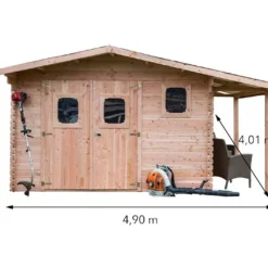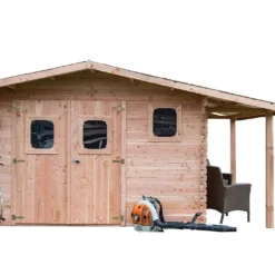 Le cabanon en bois Habrita est équipé d’un bûcher sur le côté pour y entreposer le bois de chauffage ou pour créer un espace de détente couvert à l’extérieur. Il est fabriqué en France et bénéficie d’une surface totale de 19,65 m².