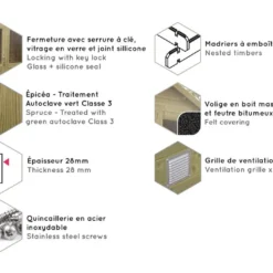 Le chalet en bois dispose d’un traitement autoclave classe 3 qui permet de protéger le bois des agressions extérieures, et renforce sa durabilité sur plusieurs années. Il ne sera donc pas nécessaire de mettre des fongicides ou des insecticides sur votre cabanon de jardin, mais vous pouvez lasurer ou mettre de la peinture sur l’abri en bois comme ce dernier n’est pas teinté.