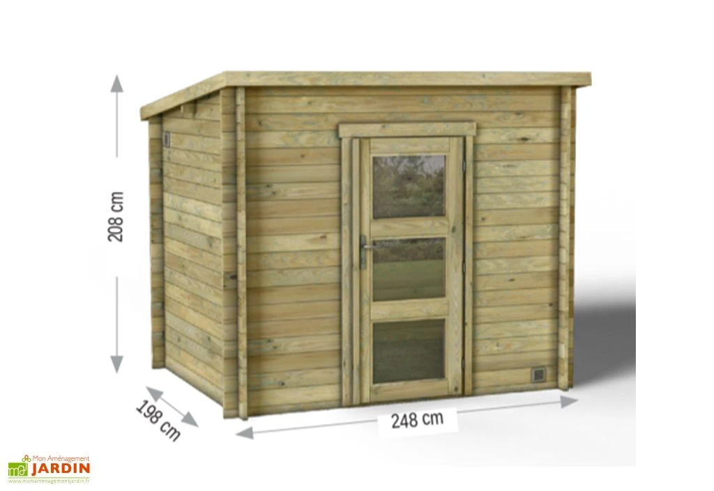 L’abri de jardin en bois mesure 250 x 213 cm, pour 208 cm de haut. Les dimensions de l’extérieur sont de 248 x 198 cm, et celles de l’intérieur sont de 224 x 174 cm. Il est doté d’une porte vitrée de 75 x 175 cm disposant d’une serrure à barillet. Deux grilles de ventilation sont fournies afin d’aérer l’abri de jardin. Le cabanon ne possède pas de plancher, il est donc conseillé de l’installer sur une dalle de béton.
