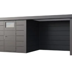 Cette cabane de jardin avec auvent est fabriquée en acier galvanisé, un matériau intéressant car insensible à la corrosion, robuste et résistant aux rayons UV, le tout sans nécessiter d’entretien particulier. Elle possède des parois de 0,9 mm d’épaisseur qui supportent un toit plat (inclinaison : 2°) constitué de panneaux sandwich isolés de 4 cm d’épaisseur. Cette solide toiture pourra supporter une charge de neige de 220 kg/m² et elle intègre une gouttière avec descente.