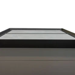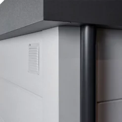 Côté couverture, cet abri de jardin s’est vue doté d’un toit plat (inclinaison du toit : 2°) constitué de panneaux sandwich isolés de 4 cm d’épaisseur. Il pourra supporter une charge de neige maximale de 220 kg/m² et intègre un système de gouttière avec descente conçu pour assurer le bon écoulement de l’eau de pluie pendant et après une averse.