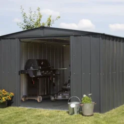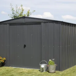 L’abri de jardin dispose d’un design actuel, qui s’intègre facilement dans n’importe quel jardin, d’abord grâce à sa couleur gris foncé (RAL 7021) mais aussi grâce à ses parois qui ne sont pas lisses. Les panneaux sont légèrement martelés apportant ainsi un léger relief, élégant.