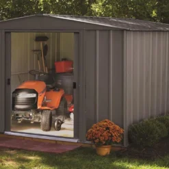 Le grand abri de jardin est pratique et solide grâce à ses panneaux de 0,3 cm d’épaisseur et à sa grande double porte coulissante de 141 x 165 cm (l,h). Elle vous permet d’y entrer et d’en sortir facilement même avec des équipements imposants tels qu’une tondeuse à gazon ou un salon de jardin. La porte peut se verrouiller facilement grâce à un cadenas (non inclus).