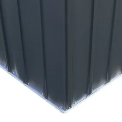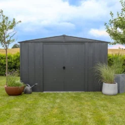 L’abri de jardin en métal Spacemaker fabriqué aux Etats-Unis mesure 2,42 m de longueur, 3,13 m de largeur et 1,98 m de hauteur. Il est constitué de panneaux en acier galvanisé de 0,3 cm d’épaisseur. La cabane dispose d’un look contemporain grâce à ses panneaux gris foncés martelés, donnant un léger relief élégant.