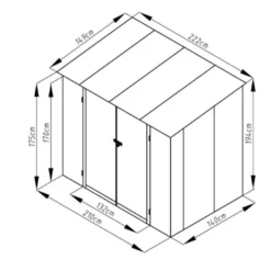 L’abri de jardin en métal mesure 1,49 m de profondeur, 2,13 m de largeur et 1,94 m de hauteur et dispose d’une toiture une pente en acier galvanisé à chaud avec panneaux pré-peints. L’abri est en acier zingué à chaud et galvanisé pour une excellente résistance à la corrosion, d’une épaisseur de 0,25 mm.