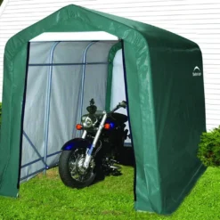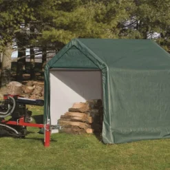 Cet abri de jardin démontable de 3,24 m² vous permettra de stocker et protéger vos poubelles, votre bois de chauffage ou encore vos vélos. Il mesure 1,80 m de longueur, de largeur et de hauteur et il est équipé d’une porte enroulable de 130 x 150 cm (l x h) avec fermetures éclair.