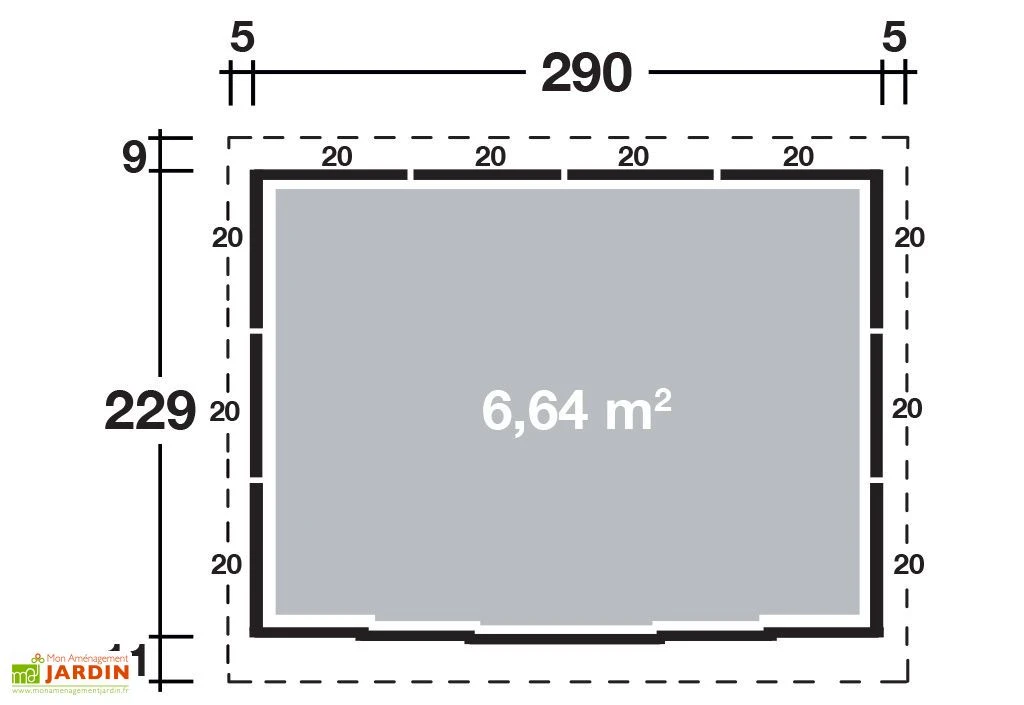 Les dimensions intérieures de votre abri sont de 2,90 x 2,29 x 2,11 m (l,l,h) pour une surface utile de 6,6 m2. Les dimensions extérieures au sol sont de 2,90 x 2,29 m (l,l) et les dimensions extérieures hors tout sont de 3 x 2,49 x 2,11 m (l,l,h). Votre abri est garanti 20 ans.