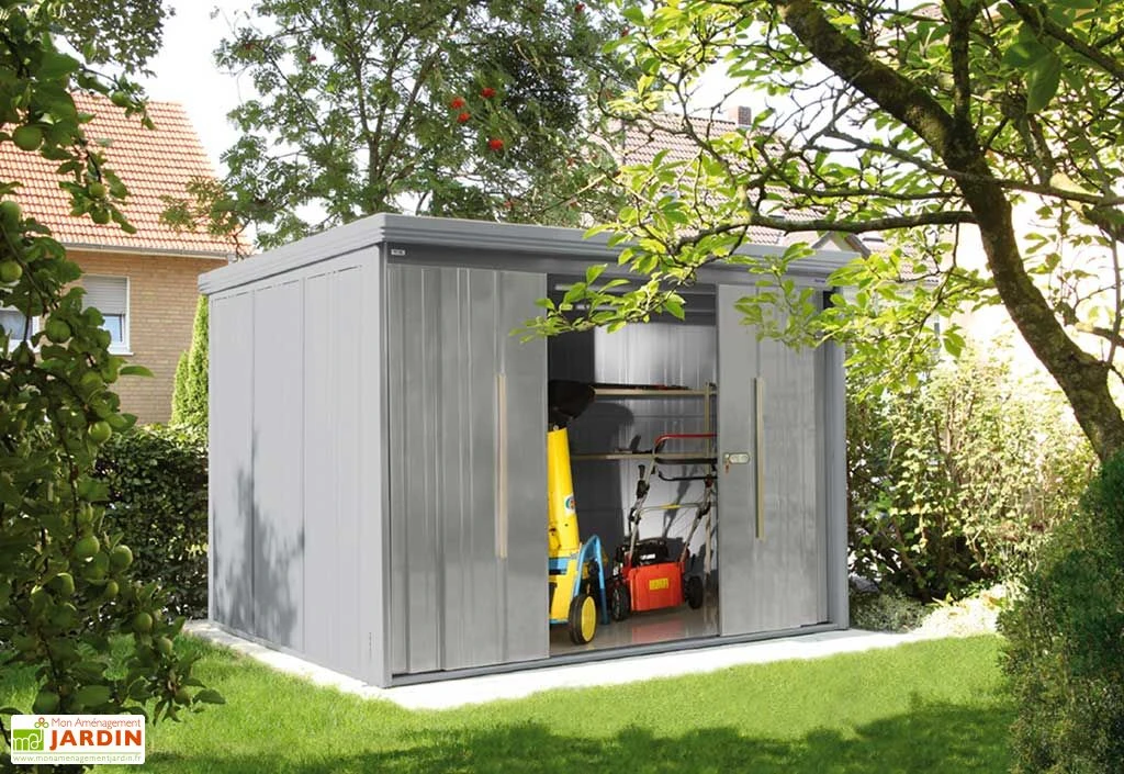 Votre abri en métal peut supporter une charge de neige maximale de 300 kg/m2. La double porte mesure 1,54 x 1,87 m (l,h). Le toit possède une pente de 1,5°, ce qui donne une hauteur de 2,11 m en façade et de 2,05 m à l’arrière, pour permettre l’évacuation de l’eau.
