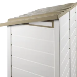L’abri de jardin Evo 100 de chez Garofalo est fabriquĂ© en Italie. Il est en PVC et ABS (plastique rĂ©sistant aux chocs). Les parois sont composĂ©es de lames alvĂ©olĂ©es en PVC de 20 mm d’épaisseur beige. Le toit en ABS monopente, d’un seul bloc, est traitĂ© anti UV. Il possède des reliefs imitation tuiles de couleur marron.Â