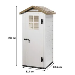 La cabane de jardin mesure 82,5 cm de longueur, 82,5 cm de largeur et 203 cm de hauteur faĂ®tage. Ses dimensions intĂ©rieures sont de 76 x 76 cm et la hauteur des parois est de 177 cm. Ses dimensions hors tout sont de 96,5 x 96,5 cm.Â