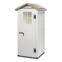 L’abri de jardin en PVC dispose d’une porte battante avec charnières pouvant se fermer Ă clĂ© grâce Ă un verrou mĂ©tallique. Le cadenas n’est pas inclus. La porte dispose d’un vitrage en PVC.Â