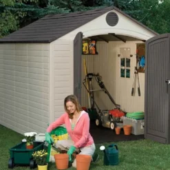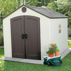Votre abri de jardin de chez Lifetime possède des parois beige et une toiture en polyĂ©thylène marron/gris supportĂ©es par une charpente en acier. Le plancher est compris dans la livraison. Cet abri mesure 3,05 m de long pour 2,44 m de large et 2,44 m de haut. Il possède une surface hors tout de 7,44 m² et une surface utile de 6,10 m². L’abri de jardin comporte une double porte marron/gris de 140 cm de large et 193 cm de hauteur, ce qui vous permet de rentrer aisĂ©ment Ă l’intĂ©rieur, et 1 fenĂŞtre latĂ©rale ainsi que 4 petits puits de lumière dans le faĂ®tage. Deux bouches d’aĂ©ration sont Ă©galement prĂ©sentes : une Ă l’avant et une Ă l’arrière.Â