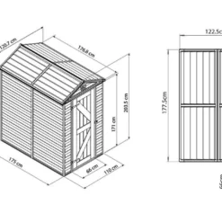 L’abri de jardin en polycarbonate dispose d’un cadre en aluminium qui lui offre une rigiditĂ© Ă toute Ă©preuve et une soliditĂ© supplĂ©mentaire. Ses dimensions intĂ©rieures sont de 171,4 cm de longueur pour 106,3 cm de largeur, soit une surface intĂ©rieure de 1,82 m². Concernant les dimensions au sol, elles sont de 175 x 110 cm.Â