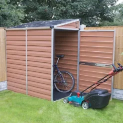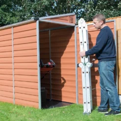 La toiture de cet abri de jardin est Ă©galement constituĂ©e de panneaux de polycarbonate, mais ces derniers sont lĂ©gèrement transparents. Ils laissent donc passer la lumière naturelle tout au long de la journĂ©e mais sont suffisamment opaques pour masquer l’intĂ©rieur de l’abri. Cet intĂ©rieur et son contenu sera d’ailleurs bien protĂ©gĂ©, grâce Ă la prĂ©sence d’une porte avec loquet que vous pourrez verrouiller Ă l’aide d’un cadenas.Â