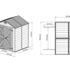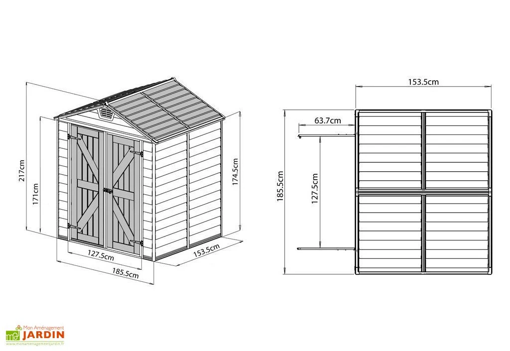 La cabane mesure 153,5 cm de profondeur, 185,5 cm de largeur et 217 cm de hauteur. Elle offre une surface de 2,85 m² vous permettant de stocker vos outils, votre mobilier de jardin, vos vĂ©los ou encore votre tondeuse. Elle est Ă©quipĂ©e d’une grande double porte de 127,5 x 171 cm (l,h) Ă©quipĂ©e d’un loquet pour la verrouiller avec un cadenas (non inclus). Son seuil bas permet de faire entrer facilement vos diffĂ©rents Ă©quipements en les faisant rouler.Â