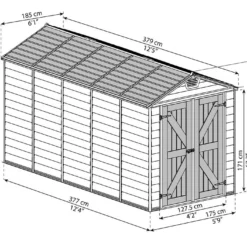 L’abri de jardin en polycarbonate mesure 3,78 m de profondeur pour 1,85 m de largeur et 2,17 m de hauteur ce qui lui offre une grande superficie de plus de 7 m² vous permettant de stocker vĂ©los, mobiliers de jardin, outils ou encore gros Ă©quipements. Sa grande double porte vous permet d’entrer et de sortir facilement vos Ă©quipements. Elle mesure 127,5 x 171 cm (l,h).Â