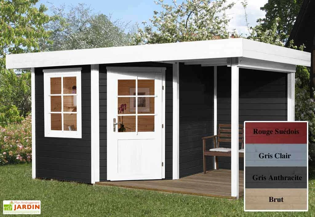 Le toit du chalet possède un dĂ©bord de 50 cm en avant, 24 cm en arrière et 20 cm sur les cĂ´tĂ©s. La hauteur totale de votre abri est de 2,24 m. Deux dimensions sont proposĂ©es dans vos options (abri + appentis compris) : 2,40 x 3,90 m (l,l) ou 3 x 4,50 m (l,l). Votre abri existe en 4 coloris au choix : brut, rouge suĂ©dois, gris clair ou gris anthracite, Ă sĂ©lectionner selon vos goĂ»ts.Â