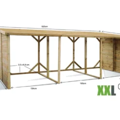 Cet abri range-bûches affiche des dimensions hors tout de 520 x 217 cm (largeur, profondeur), sur 206 cm de hauteur. Sa structure possède une épaisseur de 1,6 cm. La largeur des panneaux latéraux de votre abri est de 200 cm. Il pourra accueillir une très grande quantité de bûches de taille standard (33 – 40 – 50 cm de long).