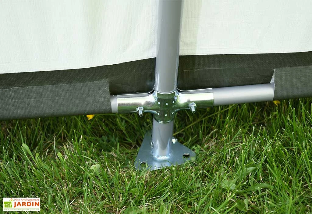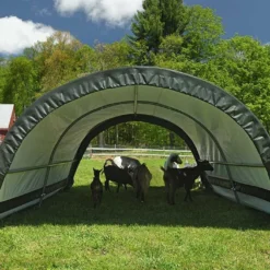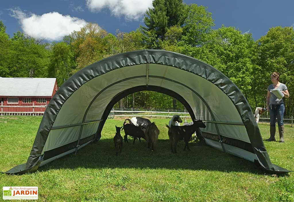 Cette tente de pâturage est livrée accompagnée de sangles d’arrimage et d’ancrages, pour une fixation au sol et une stabilité optimales. Ses dimensions de 3 x 2,60 m (longueur x largeur) lui permettent de couvrir une surface de 7,8 m² (hauteur au centre de l’abri : 1,50 m), un espace que vous pourrez également mettre à profit pour ranger des outils de jardin ou du matériel agricole.