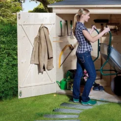 L’armoire de rangement extĂ©rieur est en bois issu de forĂŞts nordiques. Le bois est brut, vous pouvez le traiter contre la moisissure et les insectes Ă l’aide d’un fongicide et d’un insecticide pour lui assurer une longue durĂ©e de vie. Vous pouvez Ă©galement lui appliquer une lasure pour le protĂ©ger des UV et Ă©viter qu’il ne grise avec le temps.Â