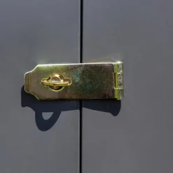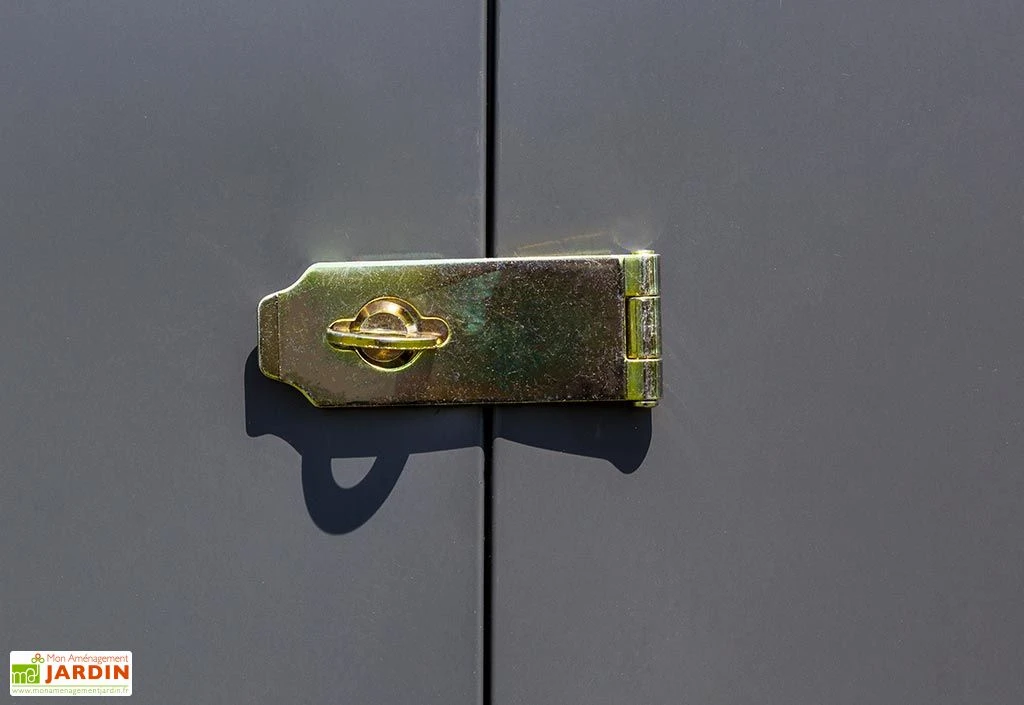 MalgrĂ© sa petite largeur, cette armoire de rangement d’extĂ©rieur s’est vue dotĂ©e d’une double porte de 98 x 153 cm permettant de pĂ©nĂ©trer aisĂ©ment en son sein. Cette porte dispose par ailleurs d’un loquet et pourra donc ĂŞtre verrouillĂ©e (cadenas non inclus). Notez enfin la prĂ©sence d’une toiture en pente capable de supporter une charge maximale de 100 kg/m², en cas de chutes de neige notamment. Son inclinaison permettra Ă©galement d’assurer le bon Ă©coulement des eaux pluviales pendant une averse.Â