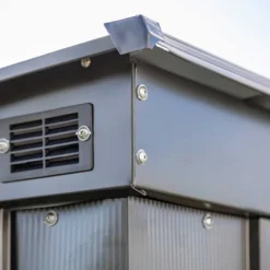 Robuste et fiable, cette armoire de rangement d’extĂ©rieur est conçue Ă partir de tĂ´le d’acier galvanisĂ© de 0,3 mm d’épaisseur, parois comme toiture. Très solide, ce matĂ©riau ne craint ni la corrosion, ni les intempĂ©ries, et ce sans nĂ©cessiter de traitement ou d’entretien particulier. Sa finition anthracite lui permettra par ailleurs de s’intĂ©grer plus aisĂ©ment dans votre extĂ©rieur.Â
