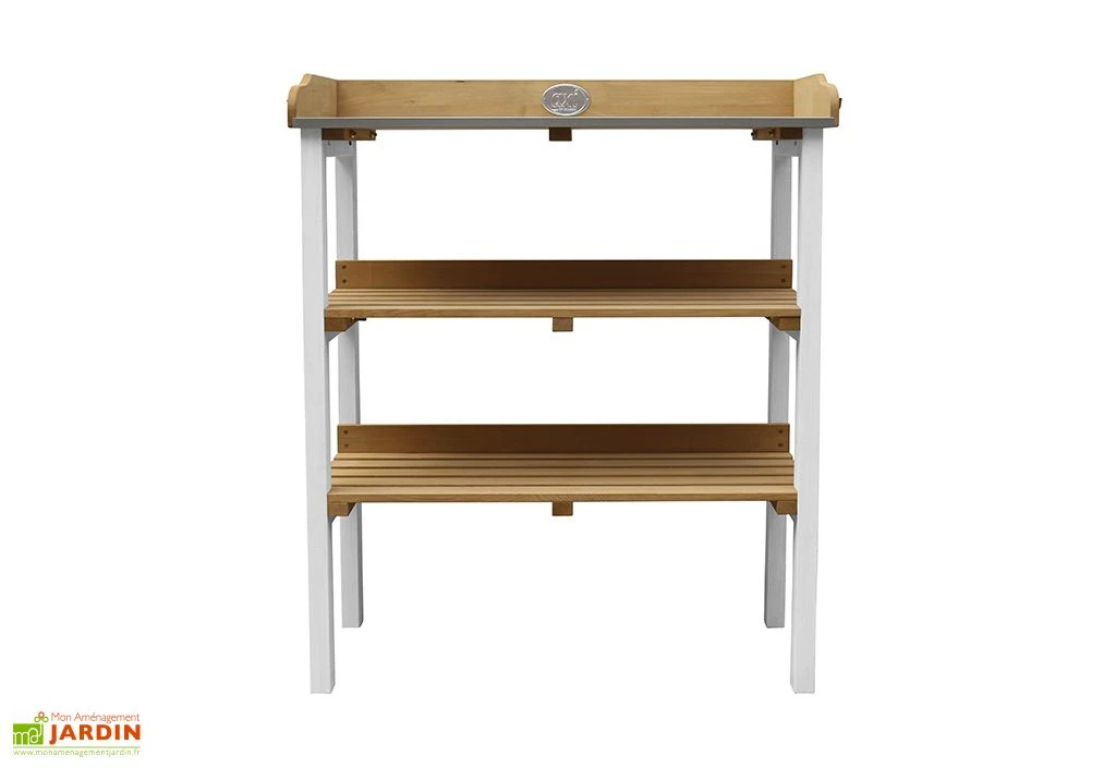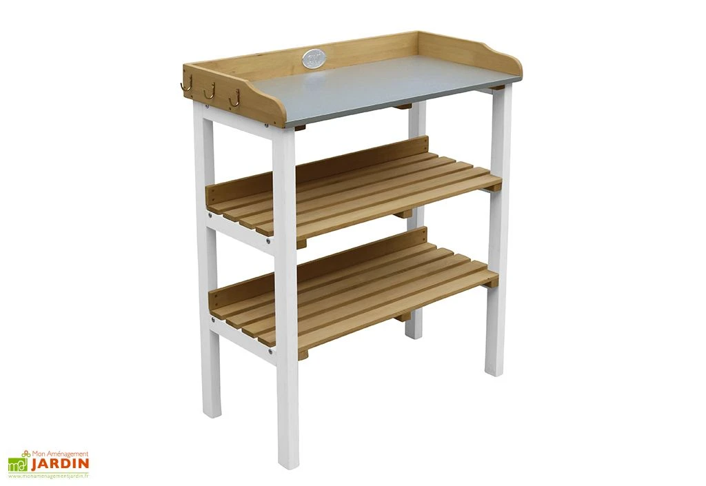 Cette table de rempotage signée Axi trouvera parfaitement sa place sur un balcon, dans un jardin ou dans une petite serre. Elle ne mesure en effet que 76 cm de long sur 37 cm de profondeur et 91,5 cm de haut, ce qui lui permet de n’occuper que peu d’espace. Elle se compose d’une structure en bois et d’un plan de travail en métal zingué, le tout complété par deux étagères sur lesquelles vous pourrez poser vos plants ou des sacs de terreau, par exemple. A noter également, la présence de crochets auxquels accrocher vos outils de jardinage.Â